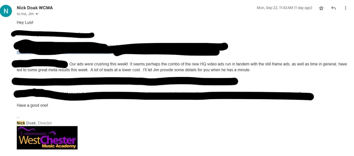 1) Every Month we: write, hire actors, film and edit two High quality Parent centered ads that get you students systematically. This is the 1st key to your success: Consistantly lauching new ads every month. That's how the Big Boys play.